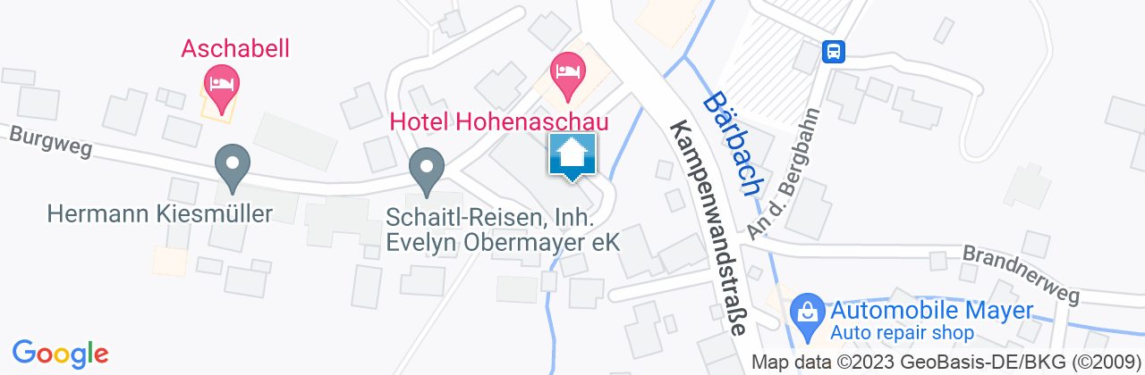 En voiture : autoroute A8 Munich/Salzbourg - sortie Aschau / Frasdorf ou Bernau, à gauche direction Aschau/Kampenwandbahn.En venant de Frasdorf : passer l'entrée d'Aschau i.Ch., continuer tout droit sur la Rosenheimer Straße, passer devant la station-service. Suivre la route sur environ 2 km à travers le village en direction du téléphérique de Kampenwand et du château de Hohenaschau. En dessous du château de Hohenaschau, dans un virage prononcé à gauche, se trouve sur la droite la maison Burg et la maison Hohenaschau.