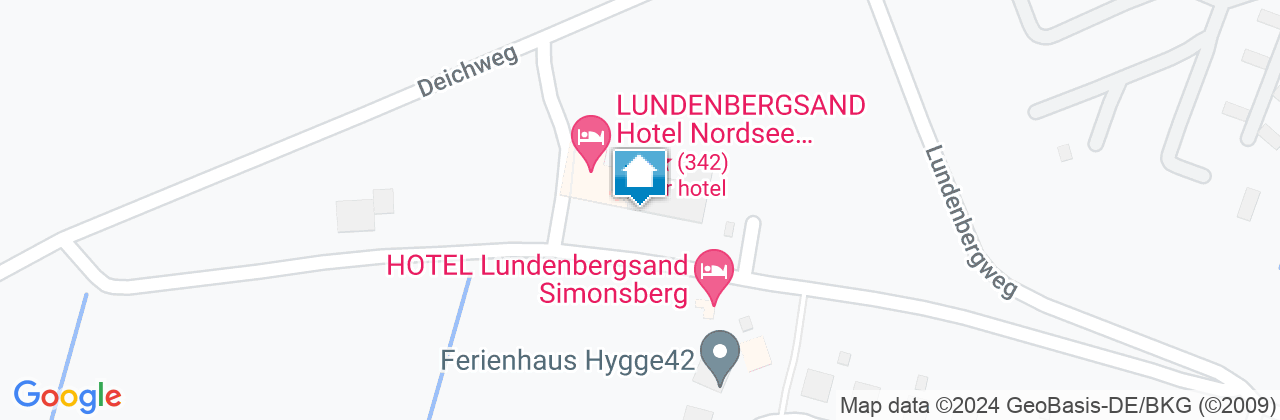 The thatched hotel "Lundenbergsand" is located directly at the North Sea. Simonsberg is approx. 8 km drive away from Husum. The modern rooms have ensuit bathrooms, hair dryer, TV, telephone, internet access, radio and desk. It is a non-smoking hotel. The breakfast buffet is tasty start for a beautiful vacation day. In the afternoon enjoy our home made cakes and for lunch our à la carte cuisine. You can relax in the panorama pool at the fire place after a walk or you sunbath at the Kaptain`s Lounge after enjoying the nice wellness-area. A highlight is the North Sea silt – steam bath: A haunting slit bath ritual with afterward massage for skin and mind. North Sea holiday with wadden hiking, dike walks, bicycle ride, surfing and bathing. A golf course is 7 km away and has a 18-hole-site.