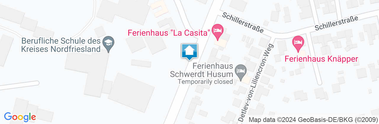 Das Ferienhaus "La Casita" liegt im nördlichen Teil von Husum. Der Marktplatz und der Hafen sind in ca. 20 Gehminuten erreichbar. Die Nordsee und den Badestrand erreichen Sie nach ca. 5 km. Die Entfernung zum Husumer Bahnhof beträgt 3,5 km. Die Fahrzeit zur Messe Husum & Congress beträgt ca. 6 Fahrminuten. Weitere Angaben: PKW-Stellplatz vorhanden, Fahrradabstellplatz, Nichtraucher, keine Haustiere, Waschmaschine, W-LAN. DTV-Klassifizierung nicht teilgenommen.