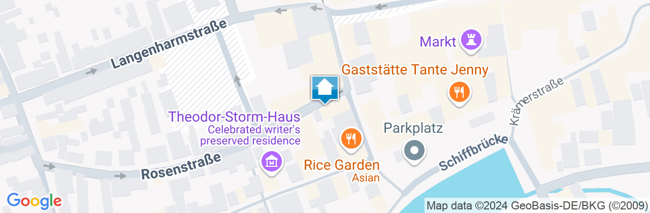 Die Ferienwohnung Ankerliebe liegt in einem historischen Mehrfamilienhaus in der Innenstadt von Husum. Der Hafen, der Marktplatz, vielfältige Einkaufsmöglichkeiten und Gastronomiebetriebe sind in wenigen Gehminuten erreichbar. Die Entfernungen zur Nordsee/Badestelle Dockkoog beträgt ca. 3 km. Der Husumer Bahnhof ist ca. 500 m entfernt. Die Fahrzeit zur Messe Husum & Congress beträgt ca. 10 Minuten.