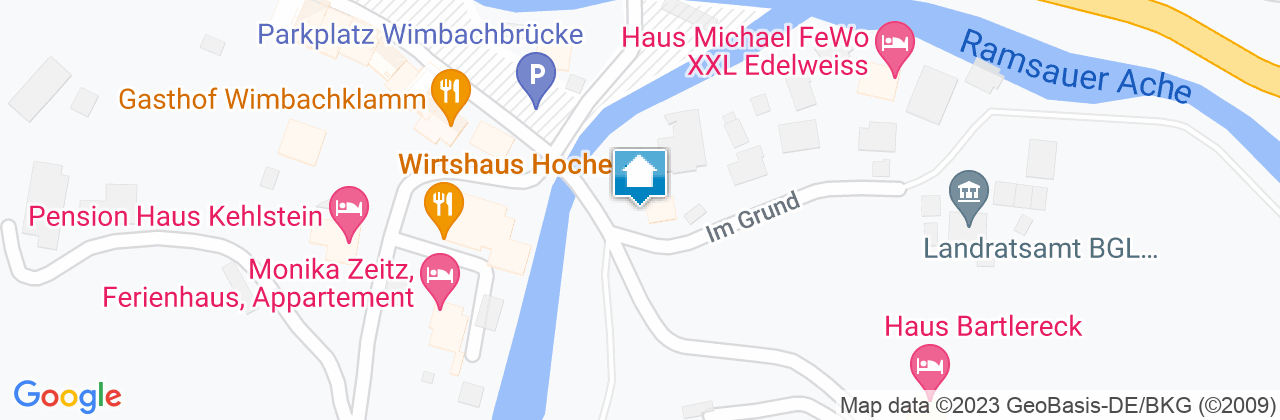Freeway A 8 Munich- Salzburg until exit Siegsdorf/Traunstein, continue on B 306 direction Berchtesgaden, via Inzell, Weißbach until Unterjettenberg, from there on B 305 via Gasthaus Wachterl and Gasthof Hindenburglinde until Ramsau-Ort. Pass the entrance of the village, direction Berchtesgaden until you reach Wimbachbrücke. Turn right here, drive over the bridge and then turn left again into the street "Im Grund".Policies