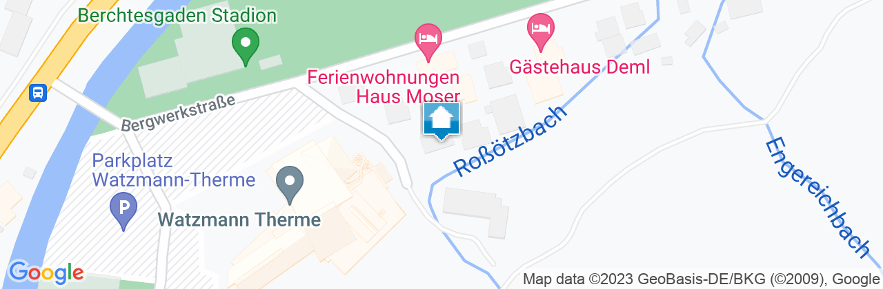 Unser Haus, im liebevoll bayrischem Stil, befindet sich in sonniger, ruhiger und zentraler Lage. Das Ortszentrum von Berchtesgaden (ca. 750m), die nächstgelegene Bushaltestelle (ca. 150m, Haltestelle Ostbahnhof) und Restaurants sind in wenigen Gehminuten erreichbar. Die komfortabel eingerichteten Ferienwohnungen sind geräumig und modern eingerichtet. In unmittelbarer Nähe (ca. 120m) befindet sich die Watzmann-Therme mit Kinder- und Erwachsenenbereich (Sauna). Unweit der Ferienwohnungen befindet sich das Salzbergwerk (ca. 300m) Berchtesgaden mit Heilstollen, die Eislaufhalle (ca. 400), ein Sportfachgeschäft ca. 200m (Skiverleih & Bikeverleih) und zwei Lebensmittelmärkte (ca. 250m / ca. 400m). Unsere Ferienwohnungen bieten Ihnen einen guten Ausgangspunkt, sowohl im Sommer für Bergwanderer als auch im Winter für Ski- und Langlauf. Das gesamte Grundstück verfügt über kostenloses W-Lan. EINSCHRÄNKUNG Sommer 2026 aufgrund Bauarbeiten: E-Ladestellen (für Typ1 und Typ2) steht Ihnen rund um die Uhr zur Verfügung (Gebühr). Sie können direkt am Haus kostenlos parken.