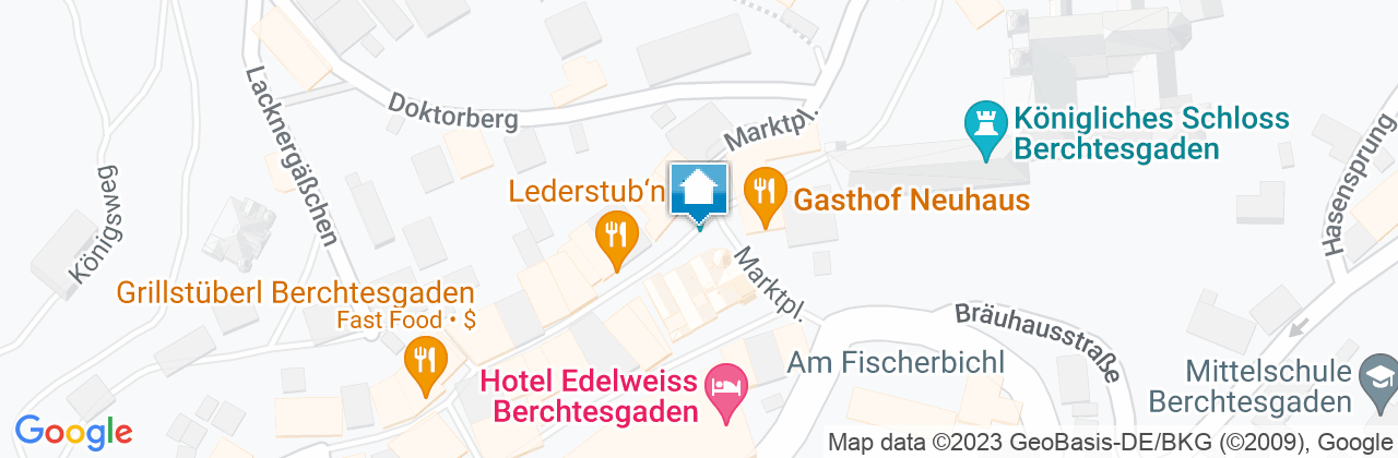 Das Gebäude befindet sich in der Fußgängerzone von Berchtesgaden zwischen den Torbögen am Schlossplatz 1½ in 83471 Berchtesgaden.Bitte rufen Sie uns auf jeden Fall nach Ihrer Buchung an, damit wir Ihre Anreisezeit besprechen können, da wir selbst nicht im Haus wohnen.Zum Be- und Entladen fahren Sie bitte um den Schlossplatz herum, sodass Sie an der Rückseite des Hauses (Doktorberg) den Eingangsbereich erreichen.