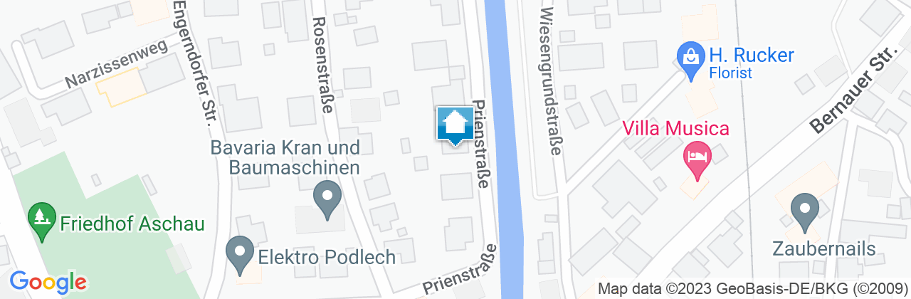 Autobahn A8, Ausfahrt Frasdorf/Aschau, Richtung Aschau abbiegen. Im Ort Aschau nach ca. 200 m, nach der Tankstelle links in die Rosenstraße abbiegen. Die erste Straße rechts in die Prienstraße einbiegen, Haus Nummer 5 auf der linken Seite.