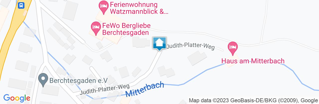 Anfahrt über Autobahn A8: München - Salzburg Autobahnausfahrt Bad Reichenhall, weiter auf der B20 Richtung Berchtesgaden. Folgen Sie dem Straßenverlauf bis zum Hauptbahnhof Berchtesgaden; im Kreisverkehr am Bhf Berchtesgaden fahren Sie aus Richtung Königssee; Sie folgen dieser Straße ca. 1 km und biegen dann links ab in die Vorderbrandstraße; der Vorderbrandstraße folgen Sie ca. 200 Meter; hier biegen Sie nochmals links ab - in den Judith-Platterweg; dieser Seitenstraße folgen Sie bis zum Ende.