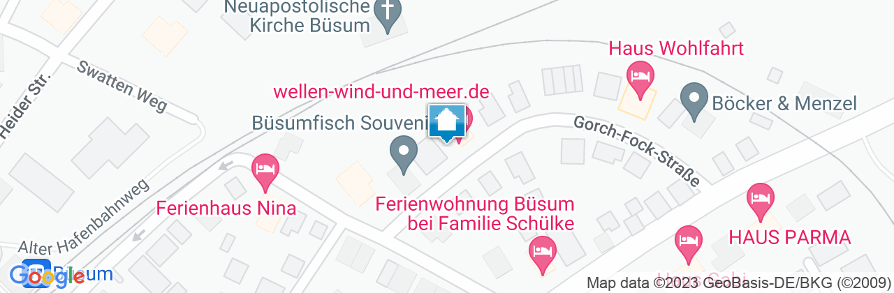 Das Wohnhaus liegt im Ortskern von Büsum und somit ca. 1300 Meter vom Hauptstrand und der Fußgängerzone sowie dem Hafen, dem "Meerzeit Büsum" Wellenbad und Spa entfernt. Verschiedene Einkaufsmärkte und Backstuben sind fußläufig zu erreichen.