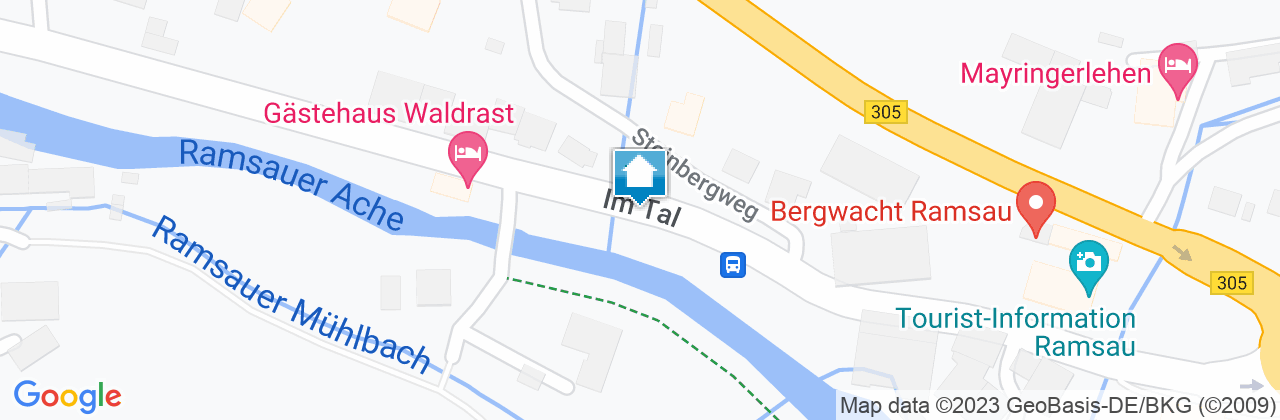Autobahn München- Salzburg bis Ausfahrt Siegsdorf/Traunstein, weiter auf der B 306 Richtung Berchtesgaden, über Inzell, Weißbach bis Unterjettenberg, von dort auf der B 305 über Gasthaus Wachterl bis Ramsau Dorf. Nach dem Haus des Gastes nach ca. 400m auf der linken Seite.