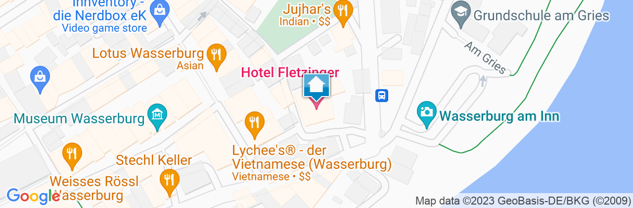 aus Richtung Traunstein: über die B304, Abfahrt Wasserburg Ost, über die Salzburger Straße in die Altstadt, über die Brücke fahren (Achtung Höhe: 3,40 m), rechts halten auf der Tränkgasse und über den Max-Emanuel-Platz in die Fletzingergasse abbiegen
