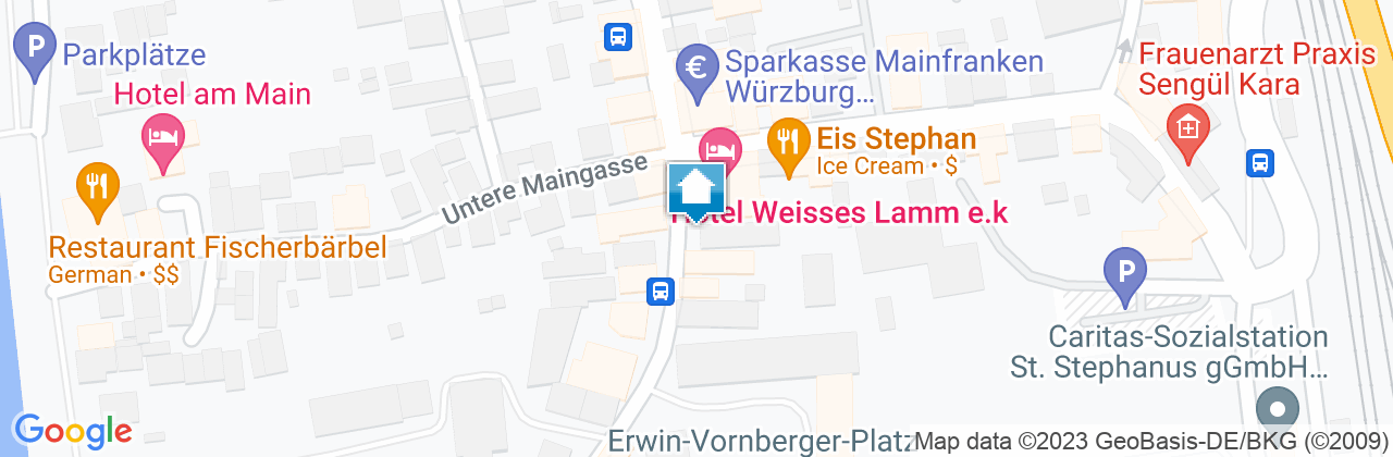 Driving at freeway A 3, take the exit Helmstadt into the direction of Würzburg. Follow the road till Würzburg; then follow the sign Fulda / Karlstadt at motor highway B 27. Take exit VEITSHÖCHHEIM ORTSMITTE and follow the sign Hotel Weisses Lamm.