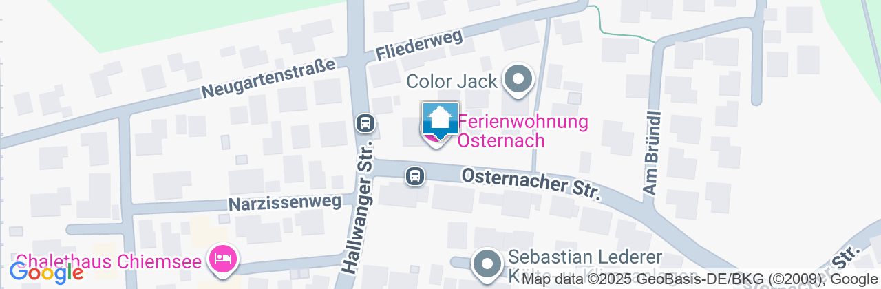 Über die A8, Ausfahrt Prien/Bernau in Richtung Prien fahren. Nach ca. 6 km an der Ampel im Zentrum (Kirche) rechts in die Seestraße einbiegen. Am Kreisverkehr unter der Bahnunterführung links in Richtung Osternach fahren, nach ca. 1km rechts auf die Osternacherstraße fahren. Die Ferienwohnung liegt in der zweiten Einfahrt auf der linken Seite.