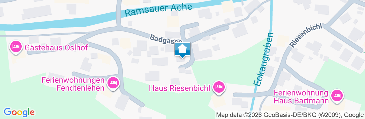 Freeway A8 Munich- Salzburg to exit Siegsdorf/Traunstein, continue on the B306 direction Berchtesgaden, via Inzell, Weißbach to Unterjettenberg, from there on the B305 via Gasthaus Wachterl toRamsau-Zentrum. Here turn right into the village and follow the road "im Tal" for approx. 1.5 km, approx. 50m after the church turn left over the bridge, then left into Badgasse. Follow the road for about 50 m and turn right onto the small slope.