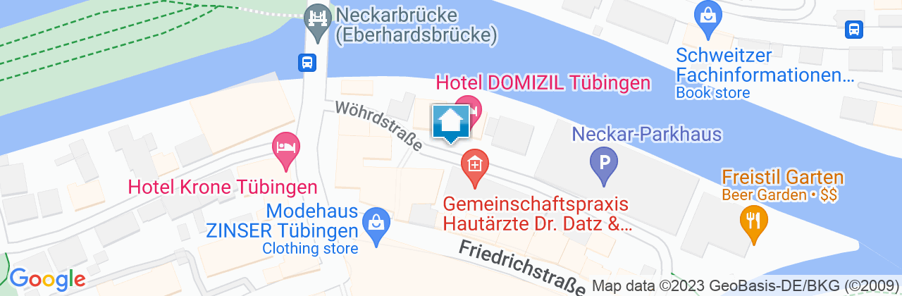 Direkt am Neckarufer in einzigartiger, ruhiger Aussichtslage haben Sie die reizvolle und malerische Altstadt Tübingens »direkt vor Augen« und »direkt vor der Tür«. Herzlich Willkommen!! 80 Doppel- und Einzelzimmer schaffen durch ihre elegante Ausstattung eine Umgebung, in der die Tage erholsam und die Nächte sehr angenehm zu verbringen sind. Lassen Sie sich verwöhnen, von leichter regionaler Küche mit Raffinesse. Den wohl besten Ausblick auf den Neckar sowie die Altstadt bietet das C.A.R.A.T in einem gemütlich modernen Ambiente und die schöne Gartenterrasse in dieser Lage ist für den Gast entspannende Sommer-Gastronomie. Ob Konferenzen, Tagungen oder Seminare - das Hotel »DOMIZIL« bietet für einen Teilnehmerkreis von bis zu 50 Personen alle Möglichkeiten der perfekten Organisation und Abwicklung. Ob Flip-Chart oder OverheadProjektion, ob Dia-Schau oder Ton-Anlage - unsere Technik steht auf Anfrage für Sie bereit. Die alte Universitätsstadt Tübingen am Neckar liegt am südlichen Rand des Naturparks » Schönbuch «, etwa 35 km vor den Toren Stuttgarts. Die malerische Altstadt mit dem Rathaus, den kleinen Gäßchen und der großen Fußgängerzone ist für Touristen aus aller Welt ein Anziehungspunkt.Abweichende Stornobedingungen des Gastgebers