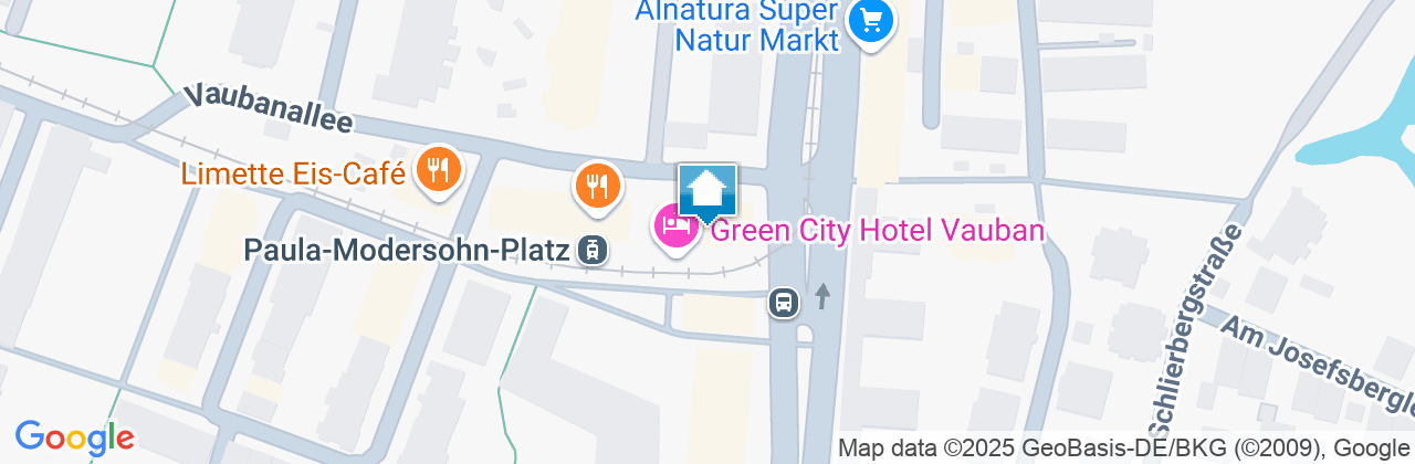 Das Green City Hotel Vauban ist im Vorzeigestadtteil Vauban, 3 km von der Innenstadt und dem Hauptbahnhof entfernt, gelegen. Mit der Straßenbahn erreicht man in 10 Minuten die Innenstadt und in 15 Minuten den Hauptbahnhof. Das Konzerthaus Freiburg am Hauptbahnhof ist 4,5 km und das Messegelände 5,7 km entfernt. Vom Hauptbahnhof erreichen Sie mit der Straßenbahnlinie 3 Vauban unser Hotel. Der Ausstieg ist an der Haltestelle Paula-Modersohn-Platz. Vom Flughafen EuroAirport Basel Mulhouse Freiburg gelangen Sie mit dem Flughafenbus (Freiburger Reisedienst) zum Hauptbahnhof Freiburg.