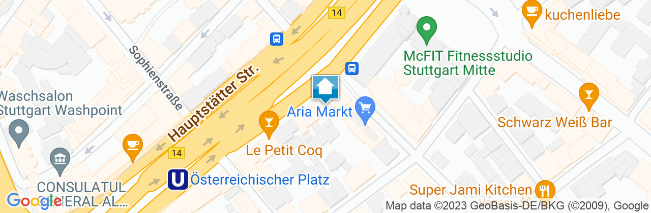 Mit der U14 Richtung Heslach bis "Österreichischer Platz", Ausgang Christophstraße (Olgastraße,Heusteigviertel)
